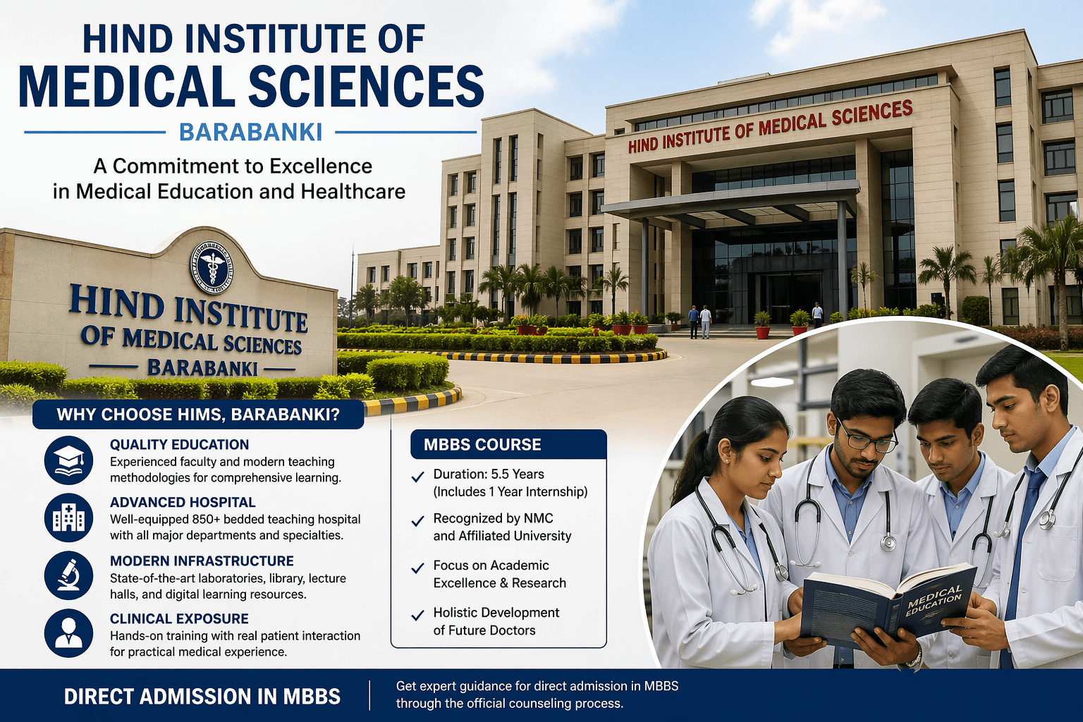 Many medical aspirants also explore opportunities for direct admission in MBBS at Hind Institute of Medical Sciences through the official counseling process after qualifying NEET. With modern facilities, experienced faculty, and a patient-focused learning environment, the college provides a strong foundation for students who wish to build a successful career in medicine.