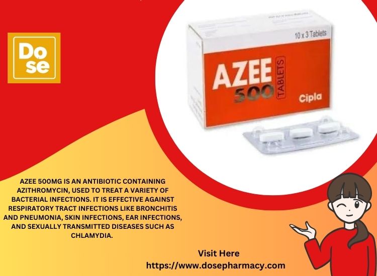 Azee 500 Tablet is a broad-spectrum antibiotic widely used to treat various bacterial infections in the body. It contains Azithromycin, a macrolide antibiotic that works by stopping the growth of harmful bacteria responsible for infections. This medicine is prescribed for conditions such as respiratory tract infections (like bronchitis and pneumonia), throat and sinus infections, skin and soft tissue infections, ear infections, and certain sexually transmitted diseases (STDs) such as chlamydia.