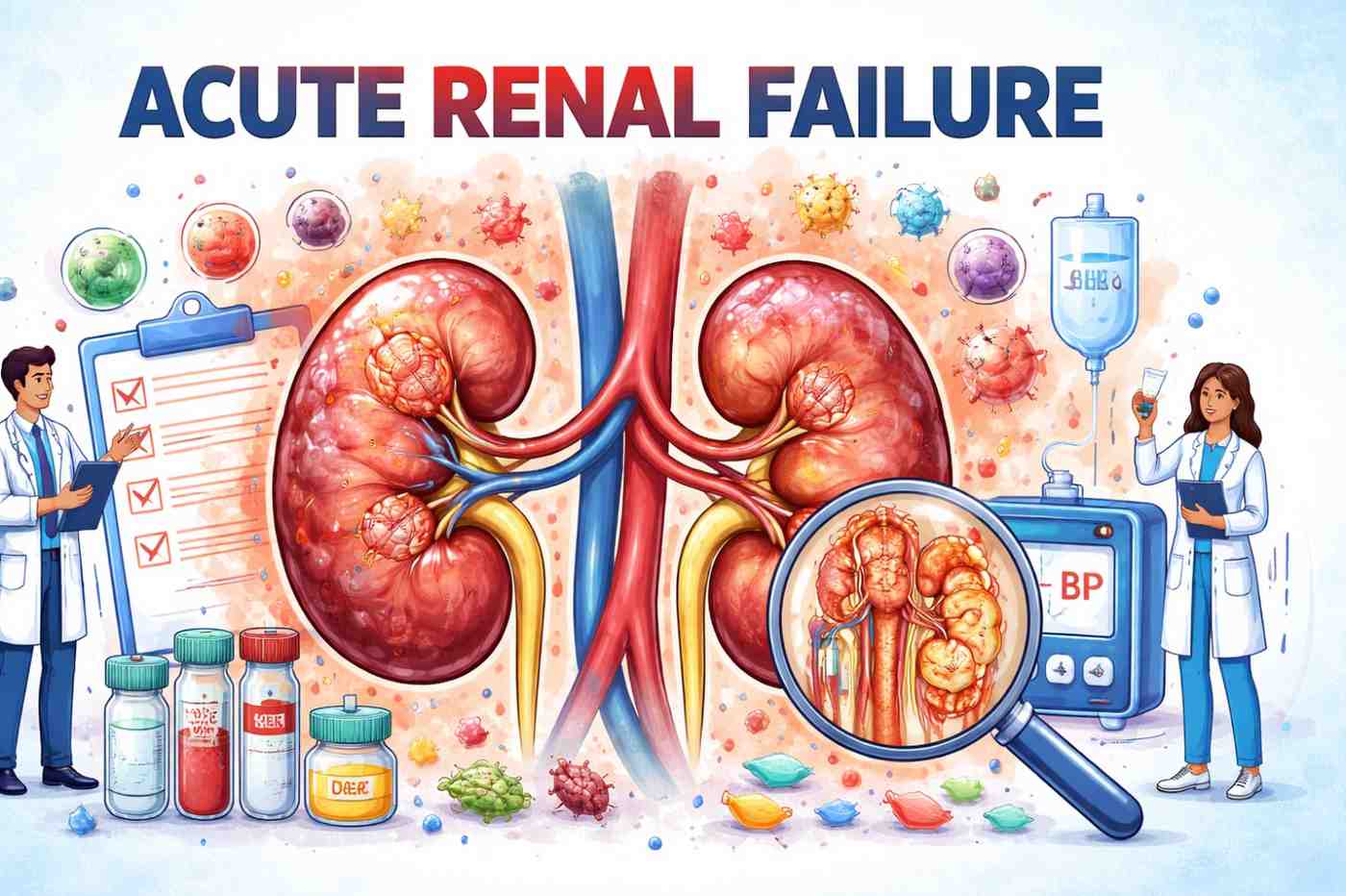 Acute Renal Failure is a sudden loss of kidney function in which the kidneys are unable to filter waste products and excess fluids from the blood effectively. This condition, also known as acute kidney injury (AKI), can develop rapidly within a few hours or days. When the kidneys fail to perform their normal functions, toxins and fluids accumulate in the body, which may lead to serious health problems.